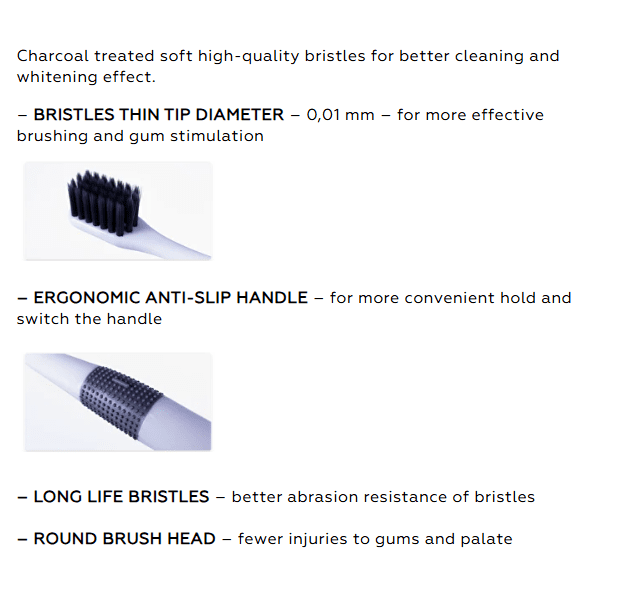 WOOM charcoal whitening tandbørste har afrundede børstehår i soft som ikke ridser dine tænder og er mere skånsom mod dit tandkød og et lidt mindre børstehoved så den kan kommer godt omkring de bagerste tænder.